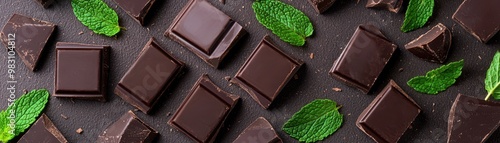 Rich dark chocolate pieces garnished with fresh mint leaves, perfect for dessert, baking, or indulgent snacking.