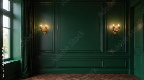 rich green interior with elegant wall sconces and wooden flooring creates cozy atmosphere