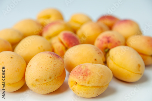 Ripe apricots fruit on white background
