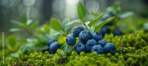 Ripe Blueberries Growing on Bush in Mossy Forest