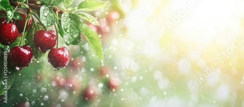 Ripe cherries on branch with raindrops and sunlight creating bokeh effect Copy Space