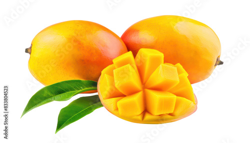 ripe fresh mangoes on white background