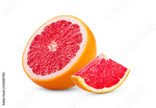 Ripe half of pink grapefruit citrus fruit isolated on white background.