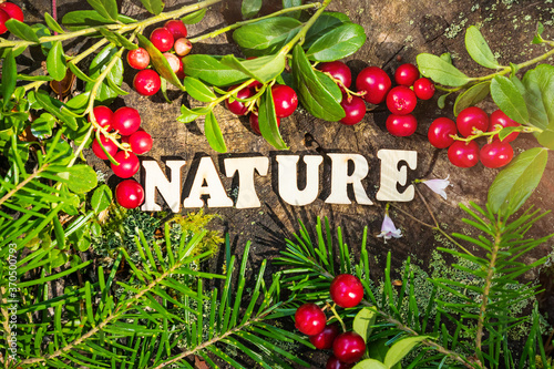 Ripe lingonberry on branches and spruce branches close-up frames stump. In the middle there is inscription in wooden letters - NATURE. Copy space, background. Beautiful wood texture.