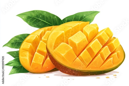 Ripe Mango Slices with Green Leaves Isolated on White Background
