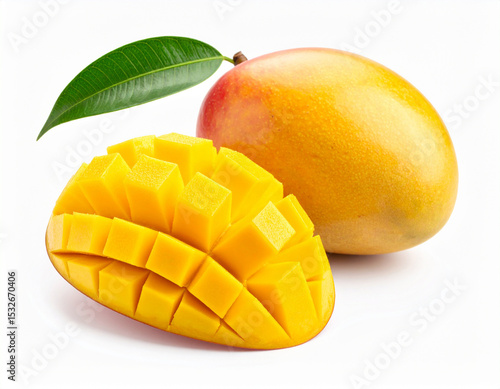 Ripe Mango with Leaf and Cubed Section