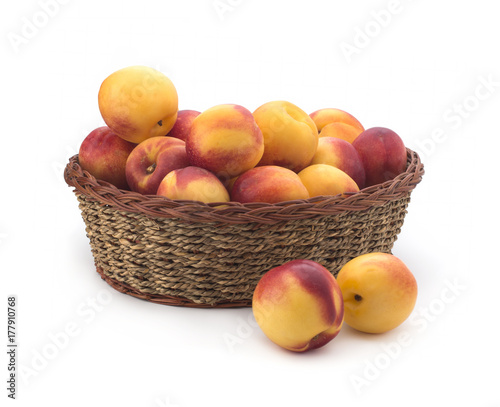Ripe peach fruit isolated in basket on white background