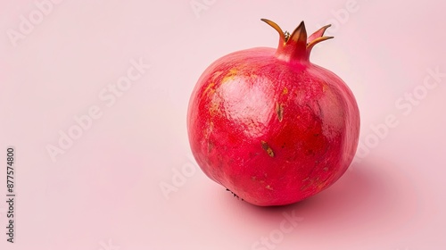 Ripe red pomegranate photographed on a light pink background to create a simple, modern composition.