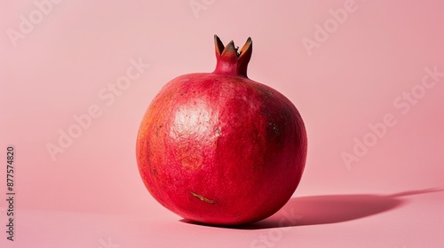 Ripe red pomegranate photographed on a light pink background to create a simple, modern composition.