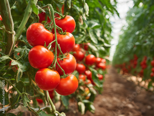 Ripe Red Tomatoes Growing on Vine in Greenhouse Setting