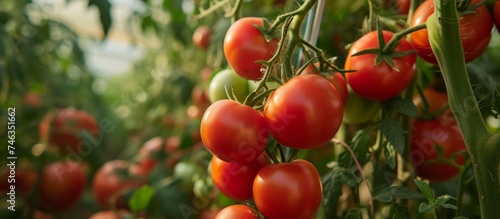 Ripe red tomatoes hanging from tree branches in a vibrant organic garden