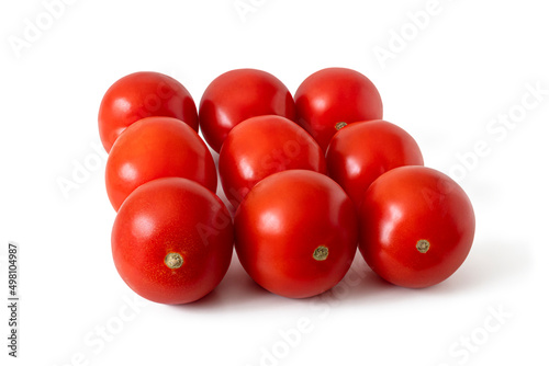 Ripe red tomatoes stacked in rows on white