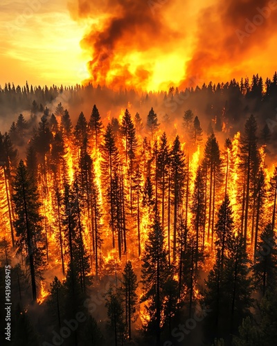 Rising temperatures threaten ecosystems A dramatic forest fire illuminates the sky as flames consume the trees, showcasing the devastating impact of wildfires.