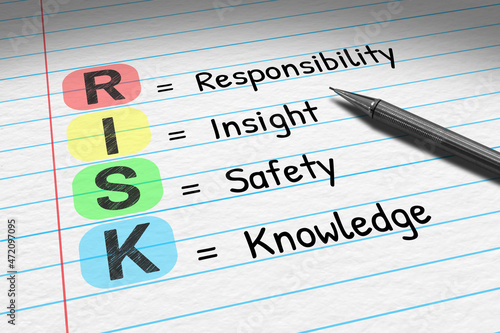 RISK - Responsibility Insight Safety Knowledge. Business acronym on note pad.