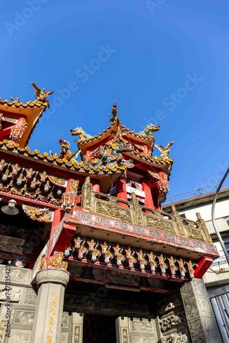 Riufang, Taiwan, 13 february 2024. View of the outside of the city temple, richly decorated. Religion symbol.