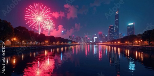 River reflecting vibrant fireworks, cityscape backdrop, water, modern, urban