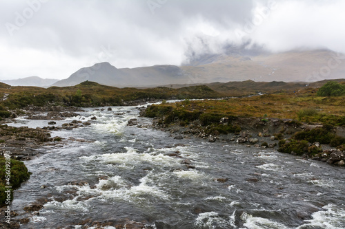 River Sligachan in the Isle of Skye in Scotland. View on a foggy day, with Cuillin mountain range in the background.