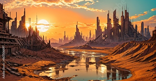 river through desert sci-fi cyberpunk city at sunset. futuristic dystopian town buildings and tall towers on the horizon. abandoned ghost town oasis.