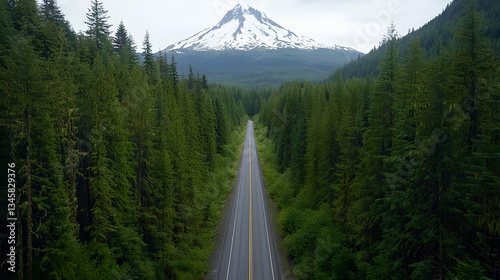 Road leading towards snow capped mountain framed by lush green forest in daylight