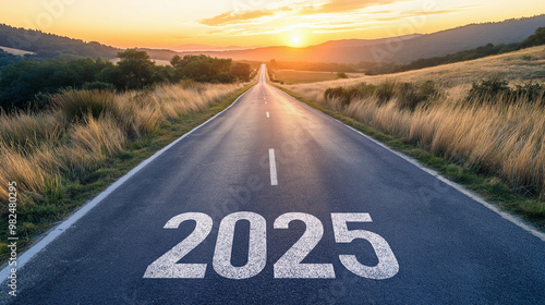 Road to "2025" with an empty road with written "2025" and arrow pointing towards the horizon to represent the future and positivity and success of the new year 2025