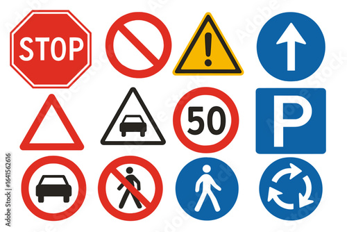 Road Traffic Signs and Symbols Collection. Vector Illustrations of Stop, Parking, Speed Limit, Pedestrian, Direction, No Entry, Warning, Prohibition, Triangular Caution, and Roundabout Signs Set
