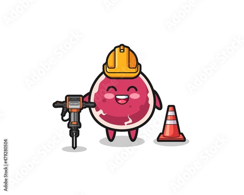 road worker mascot of beef holding drill machine