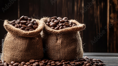 Roasted coffee beans in burlap sacks, set against a dark wooden background.