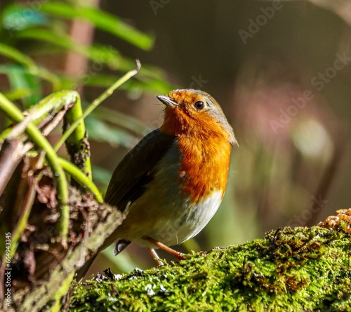 Robin (Erithacus rubecula) perched on a branch of a moss-covered tree