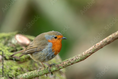 Robin with a blurred background perched on a branch close up in a forest in Scotland uk in the winter