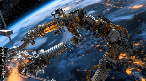 Robotic arm repairs a satellite. Intricate mechanical details are visible against a backdrop of Earth's glowing atmosphere and a spatial station. A thrilling space maintenance operation.