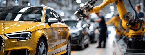 Robotic arms efficiently assemble vehicles on a dynamic production line within a high-tech factory