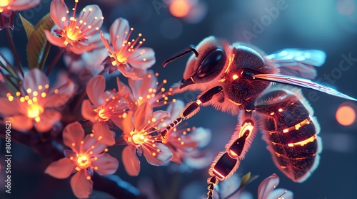 Robotic bee extracting energy from glowing sakura flowers on a dark blue background