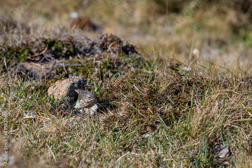 Rock Pipit (Anthus petrosus) walking among scrubland at Kynance Cove