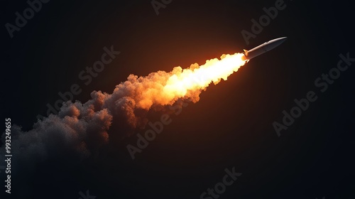 Rocket launch creates smoky trail and fire burst. Spacecraft taking off, vapor or missile light. Meteor or comet trace in sky. Gas or fume from jet or shuttle