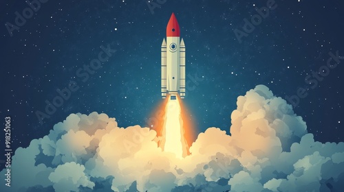 Rocket Launch into the Night Sky - A white rocket with a red tip blasts off into the night sky, leaving behind a trail of fiery exhaust and clouds. The image symbolizes progress, ambition, and the pur