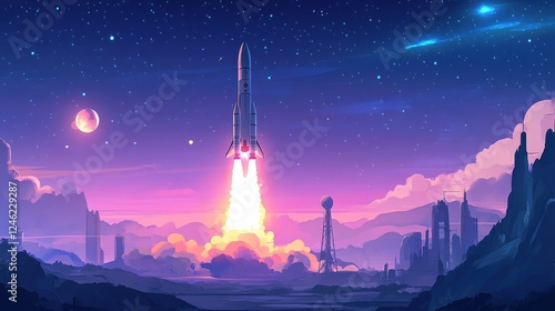Rocket launch. Space ship launches, simple spaceship on start. New project or business, cartoon flat shuttle fly in sky utter background