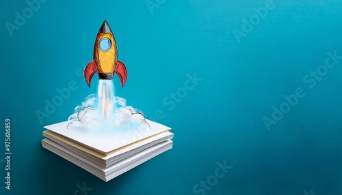 Rocket launching from stack of paperwork startup beginnings business concept cartoon art