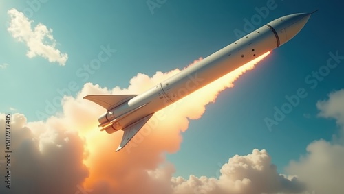 Rocket launching into a vibrant sky filled with clouds.