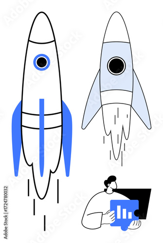 Rocket launching, symbolizing progress and innovation, with a professional analyzing a growth chart. Ideal for business strategy, startup success, innovation, progress, productivity, analytics