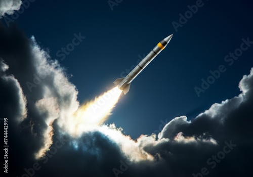Rocket launching through clouds with bright flames and dramatic sky in visualelectric din