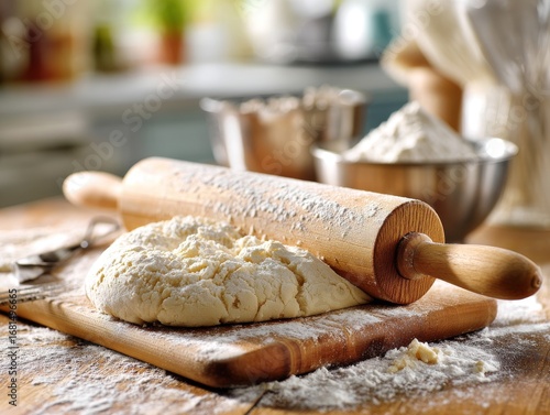 Rodillo aplastando una masa de harina en una cocina bien iluminada y organizada durante el día