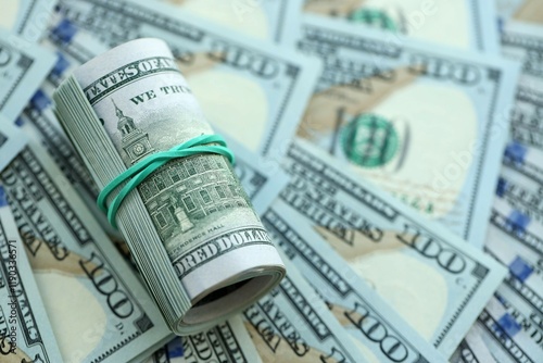 Roll of hundred dollar bills USD banknotes lies on big amount of united states money