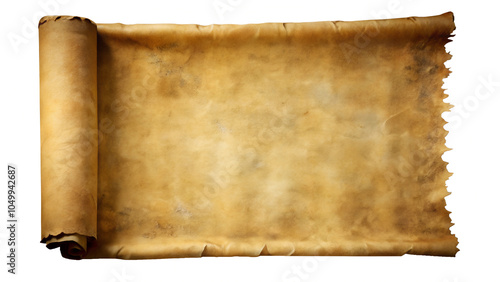 Rolled aged parchment paper with deckle edge on a white background, ideal for writing and creative projects with copy space
