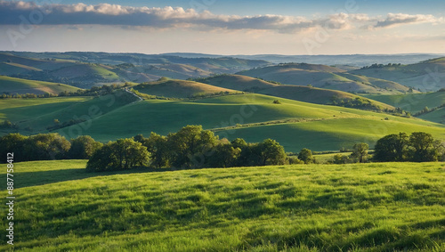Rolling countryside hills with green meadows under a setting sun and a partially cloudy sky.