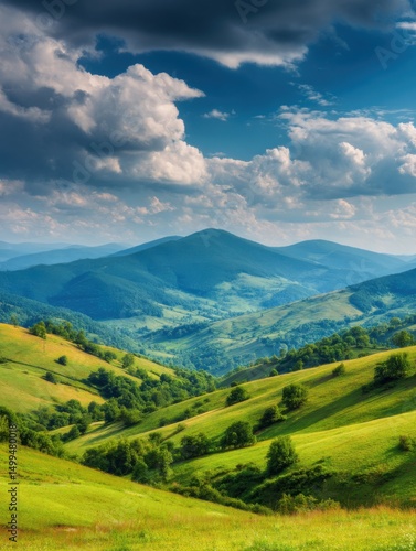 Rolling green hills and mountains under a blue sky with clouds landscape aerial view scenic vista