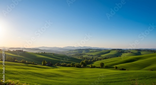 Rolling Green Hills Landscape Under Bright Clear Blue Sky