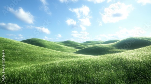 Rolling Green Hills Under a Blue Sky with Fluffy White Clouds
