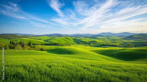 Rolling Hills and Blue Sky: A panoramic vista of rolling green hills stretches as far as the eye can see, capped by a bright blue sky with wispy white clouds.