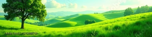 Rolling hills of green grass in the distance with tall trees in the foreground, green, tree
