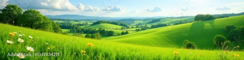 Rolling hills of lush green grass with wildflowers and trees , Summer, Wildflowers, Meadow